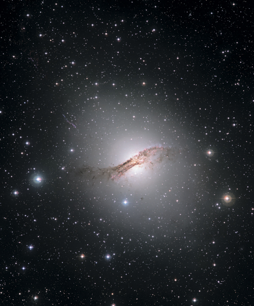 На этом снимке в видимом свете изображена еще одна знаменитая галактика – массивный эллиптический Центавр A. Мощная темная пылевая полоса сложной структуры пересекает галактику, что видно по обращенной к нам стороне