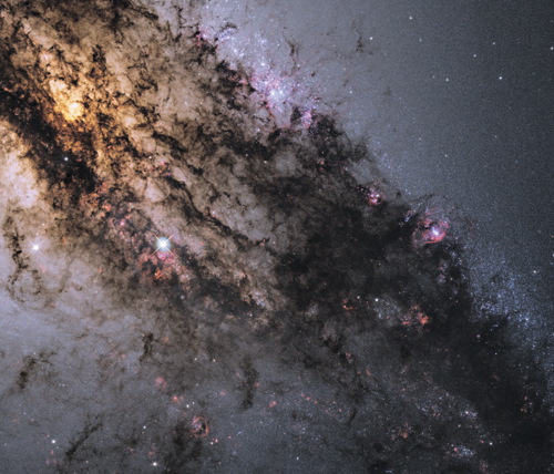 На этом снимке крупным планом представлен центр галактики Центавр A, обильно «засыпанный» межзвездной пылью, сквозь которую видно мерцание новых голубых звезд и областей HII. Центавр А – активная галактика, в которой идут процессы звездообразования и роста сверхмассивной черной дыры