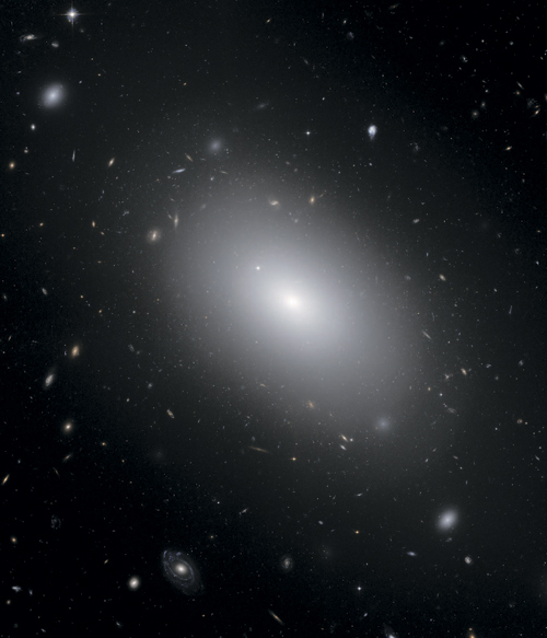 Эллиптическая галактика NGC 1132 отлично иллюстрирует тезис о безупречной сферической форме массивных древних галактик. Эллиптические галактики, как правило, пассивны: они прошли период сборки своей звездной массы в более раннюю эпоху Вселенной, когда интенсивность процесса формирования галактик была значительно выше. Как правило, эллиптические галактики обнаруживаются в самом плотном окружении – звездных группах и скоплениях – и, скорее всего, прошли через период активных слияний в прошлом. Вокруг NGC 1132 можно увидеть тысячи шаровых звездных скоплений, которые маленькими световыми точками окружают звездное свечение галактики. Как и всегда, фон снимка полон еще более далеких галактик – тех самых «городов», оставшихся за пределами нашего видения