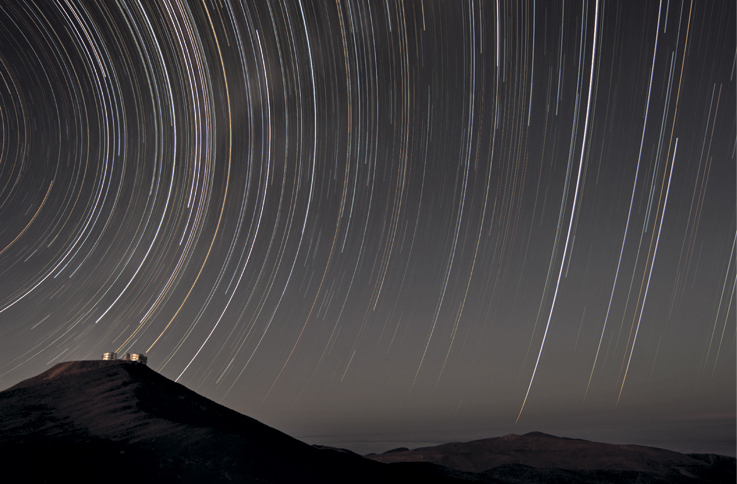 По мере того, как Земля вращается, «неподвижные» звезды оставляют свой след на небе. На этом снимке с длинной выдержкой – Очень большой телескоп на горе Серро-Параналь, который выглядит карликом на фоне небесной сферы. Даже просто глядя в это бесконечное пространство, мы можем исследовать Вселенную и ее состав и пытаться понять, как она возникла