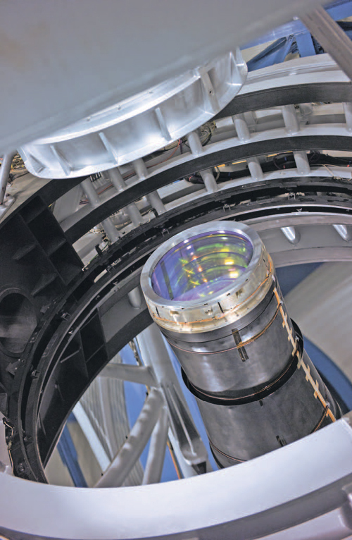 На этом снимке – зеркало и камера четырехметрового обзорного телескопа VISTA, расположенного на горе Серро-Параналь возле телескопа VLT Южной обсерватории в чилийской пустыне Атакама. Одна из его главных задач – проводить крупномасштабные исследования неба в ближнем инфракрасном диапазоне, где он может засечь большое количество очень далеких, а значит, и очень древних галактик. Секрет его успеха – широкоформатная ПЗС-камера VIRCAM: собранный четырехметровым зеркалом свет перенаправляется и фокусируется на камере, что позволяет делать большие снимки ночного неба