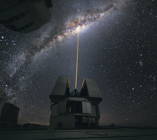 Один из четырех телескопов VLT Европейской южной обсерватории в процессе работы. Яркая полоса стреляет в небо мощным лазером, который используется для создания искусственной «звезды-поводыря» путем возбуждения атомов натрия высоко в атмосфере. Возбужденный натрий светится, как звезда, свет которой используется в качестве эталонного источника для выполнения корректирующей адаптивной оптики, которая может повысить четкость изображений, снятых с Земли, и компенсировать эффект размытия, возникающий из-за турбулентной атмосферы планеты