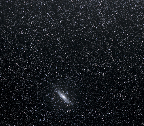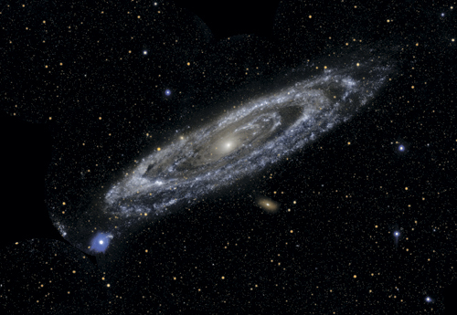 На этом широкоформатном снимке, заполненном звездами нашей Галактики, видна туманность Андромеды. Для человеческого глаза галактика Андромеда – всего лишь нечеткое пятно слабого света среди других звезд, и прежде, даже при наблюдениях с телескопом, считалось, что эта спиральная туманность и другие, ей подобные, являются частью Млечного Пути. В конце концов, Млечный Путь содержит туманные области, такие как туманность Ориона, и множество других экзотических объектов вроде шаровых скоплений; так почему же Андромеда должна быть чем-то другим? Однако когда по итогам наблюдений за цефеидами удалось определить расстояние до Андромеды и других близлежащих галактик, стало ясно, что все они – внешние системы, отделенные от нас безбрежным пространством. Это облачное пятно находится от нас примерно в миллион раз дальше, чем звезды, которые его «окружают» на небе