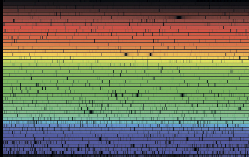 Это изображение представляет собой очень детализированную радугу – спектр нашего Солнца, где солнечный свет рассеивается на составляющие его частоты, которые мы воспринимаем как цвета. Самые короткие длины волн (и самые высокие частоты) находятся внизу (синие), и с каждым рядом длины волн увеличиваются (а частоты уменьшаются). Вертикальные темные линии – линии Фраунгофера – указывают на поглощение света различными элементами, присутствующими в атмосфере Солнца. Спектр говорит нам, сколько энергии излучается на каждой длине волны – в случае Солнца бо́льшая часть энергии излучается в УФ-части электромагнитного спектра, а пик находится около зеленой/желтой метки. Поэтому спектры можно использовать для получения данных о физике и составе Солнца. Этот метод применим ко всем галактикам, где виден объединенный свет миллиардов солнц. Спектры галактик также могут показывать эмиссионные линии, например излучение ионизованного водорода в местах звездообразования (областях HII). Поскольку мощность этих линий пропорциональна количеству молодых массивных звезд, способных ионизировать водород, мы можем использовать спектры и для измерения скоростей звездообразования галактик, а также других физических свойств. Спектроскопия – один из самых мощных инструментов в астрономии