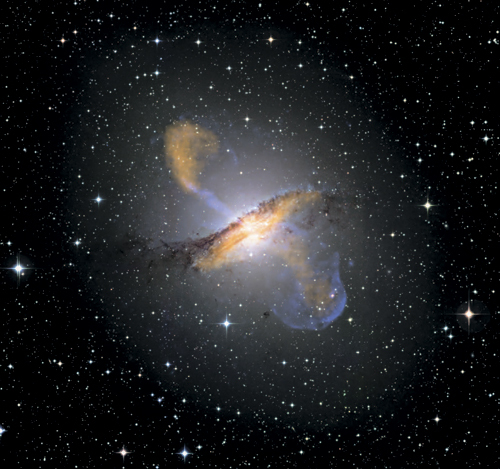 Еще одно изображение Центавра А, на этот раз включающее субмиллиметровый (оранжевый, отслеживающий холодный газ и пыль) и рентгеновский (синий, отслеживающий очень горячий газ) свет. Теперь мы видим две струи излучения, выходящие из галактики. Центавр A – мощная радиогалактика, одна из ближайших радиогалактик к Млечному Пути, содержит активное ядро, которое отвечает за это излучение. Этот снимок – прекрасный пример того, почему необходимо делать многоволновое изображение галактик: если мы хотим понять их природу, нам нужно охватывать все возможные характеристики излучения