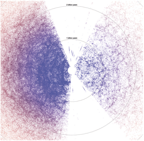 На снимке – карта Местной группы галактик, выявленных на сегодняшний день в спектроскопических исследованиях красных смещений, ключевым из которых является Слоановский цифровой обзор неба (англ. Sloan Digital Sky Survey, SDSS). Карта центрирована с учетом центра Земли и радиального увеличения космического расстояния. Эти две окружности соотносятся со временем прохождения света в 1 млрд и 2 млрд лет: когда мы смотрим на далекие галактики, то видим их такими, какими они были в прошлом, что позволяет нам изучать свойства галактик в исторической перспективе. Две клиновидные области с небольшим количеством галактик – это Зона избегания, то есть область на небе, закрываемая галактикой Млечный Путь, где плотность ее диска слишком высока и не пропускает свет из внегалактических источников. Обратите внимание на то, как галактики образуют пенистую нитевидную структуру – «космическую сеть» материи