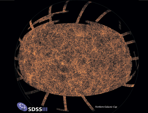 Это изображение построено с учетом расположения всех галактик, обнаруженных в SDSS. Оно и показывает общую прогнозируемую плотность галактик в большой области неба, которая называется Северной галактической шапкой. Вы можете видеть, что галактики распределены не случайным образом: есть участки высокой плотности (скопления) и четкие нитевидные структуры, образующие сеть, пронизывающую всю область распределения галактик. Это крупномасштабная структура Вселенной, где галактики возникают и меняются внутри невидимого скелета из темной материи, которая со временем эволюционировала под воздействием гравитации