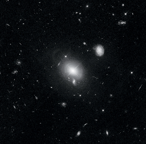 В центре этого изображения – галактика с активным ядром Маркарян 509, которая видна как яркая световая точка. Ядерная активность обусловлена сверхмассивной черной дырой, масса которой несколько сотен миллионов раз превышает массу Солнца, и она активно аккрецирует вещество. Когда материя падает на черную дыру, возникает горячий аккреционный диск, который ярко светится рентгеновским, УФ-и оптическим излучениями, иногда затмевая остальную часть галактики. Каждая массивная галактика таит в себе сверхмассивную черную дыру; установлено, что масса этого «сердца» соотносится с массой звезд в окружающем звездном балдже. Считается, что черная дыра и рост балджа связаны регулирующими механизмами обратной связи, и изучение этой части астрофизики – ключевая область исследований