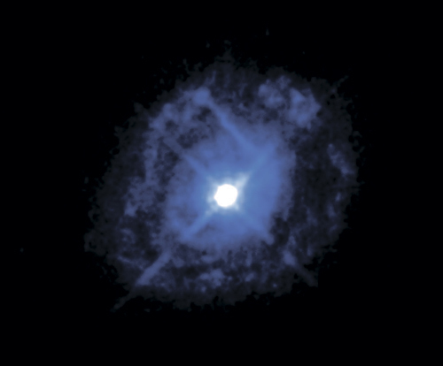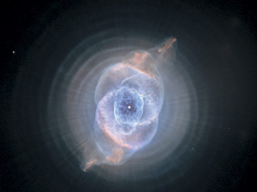 Конец звезды: туманность Кошачьего Глаза в Млечном Пути. Эта чрезвычайно сложная структура представляет собой останки звезды, которая потеряла свои слои на последних стадиях звездной эволюции, породив так называемую планетарную туманность. В центре формируется компактный белый карлик, остающийся от ядра звезды. Гибель звезд, конечная фаза звездной эволюции, – неотъемлемая часть общей эволюции галактик, поскольку она позволяет рассеивать в межзвездную среду тяжелые элементы, образующиеся внутри звезд в течение их жизни. Эти тяжелые элементы, или металлы, обогащают межзвездную среду и смешиваются с новыми поколениями звезд. Наилучшим подтверждением тому служит наша Солнечная система: существование планет и людей обусловлено тем, что облако газа, из которого образовалось Солнце, было загрязнено пеплом мертвых звезд. Кошачий Глаз – предвестие судьбы нашего Солнца, которая ожидает его через 5 млрд лет