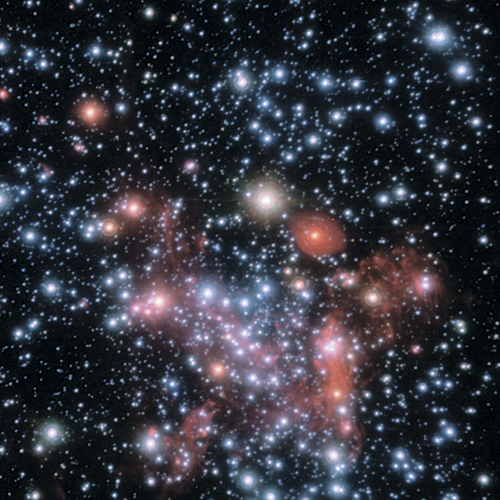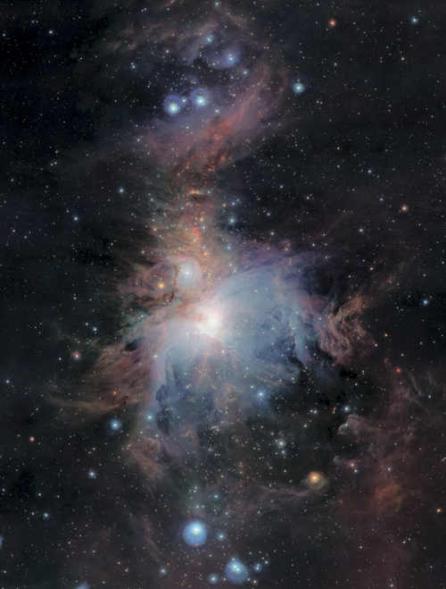 Туманность Ориона – область в нашей Галактике, где формируются новые звезды, изображаемые здесь в ближнем инфракрасном свете. Орион сияет за счет ионизированного газа и рассеянного звездного света, когда новые звезды освещают свои «колыбели», полные газа и пыли. Отображение этой области в ближнем инфракрасном свете позволяет астрономам преодолевать бо́льшую часть затемняющей пыли, которая коконом укутывает зарождающиеся звезды в центре туманности