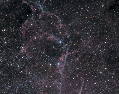 Изящные линии розово-синей туманности на изображении – это остатки сверхновой Вела, взорвавшейся более 10 000 лет назад в нашей Галактике. Сверхновые – это бурная гибель массивных звезд; они являются участниками распределения в межзвездной среде материала, образовавшегося в ходе эволюции звезд. Также они отвечают за сбрасывание энергии в непосредственно прилегающие к ним области, когда сила взрыва разгоняет окружающие газ и пыль. Это может расчистить часть газа вокруг областей звездообразования и, следовательно, помочь регулировать образование новой звезды за счет контроля количества плотного газа, поддающегося гравитационному разрушению. Совокупным эффектом многих сверхновых, взрывающихся в галактике, может быть галактический ветер, который вытесняет из нее газ и пыль. Сверхновые настолько ярки, что их можно наблюдать на космологических расстояниях