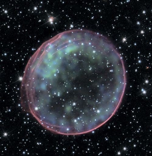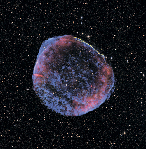 Эта почти круглая оболочка представляет собой остаток сверхновой SN 1006, показанный в радио (красный), видимом (желтый) и рентгеновском (синий) свете. Изображение демонстрирует расширяющуюся оболочку горячих газов, унесенных взрывом звезды в нашей Галактике (рентгеновские лучи показывают излучение самого горячего газа). Звезда взорвалась около 1000 лет назад, и теперь продукты звездной эволюции – тяжелые, а также другие элементы, выкованные в самом сердце взрыва, – рассеиваются обратно в межзвездную среду. Таким образом, сверхновые играют роль в обогащении межзвездной среды галактик, которая должна быть включена в новые поколения звезд, где тяжелые элементы могут образовывать такие объекты, как планеты и человечество. Их взрывная сила также выбрасывает энергию в межзвездную среду, и эта обратная связь может управлять мощными галактическими ветрами, которые переносят материю от мест образования звезд и, в экстремальных случаях, от диска самой галактики