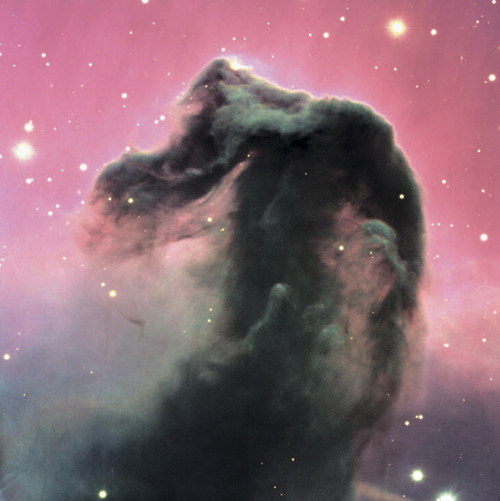 Туманность Ориона достаточно большая и яркая, чтобы ее можно было легко обнаружить в обычный бинокль. На мой взгляд, прекрасные виды туманностей, которые дает нам телескоп, – это одни из самых впечатляющих изображений естественного мира. Туманность пылает светом ионизированного газа – в основном водорода, который отличается красноватым свечением, – и синим светом, излучаемым зарождающимися звездами, который отражается от межзвездного газа и пыли и рассеивается. Также есть излучение и от других элементов, смешивающихся со светом туманности. К таким пейзажам относится, конечно же, и знаменитая туманность Конская Голова: филигранные плетения из плотного газа, который поглощает излучаемый за ним свет, придают ей подобную форму.