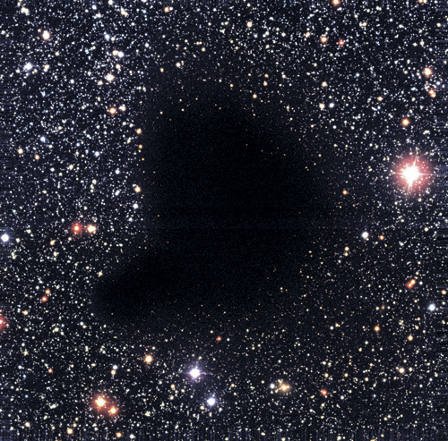 На снимке представлено темное облако Барнард 68, входящее в Каталог темных туманностей, составленный Эдвардом Эмерсоном Барнардом. Темная туманность – это облако плотного молекулярного газа и пыли примерно вдвое больше массы Солнца, расположенное к нам настолько близко, что между нами даже нет никаких промежуточных звезд. Облако непрозрачно для фонового света, поэтому на оптических изображениях оно выглядит совершенно темным. В будущем Барнард 68 под воздействием гравитации будет разрушаться и, возможно, даст жизнь новой звезде