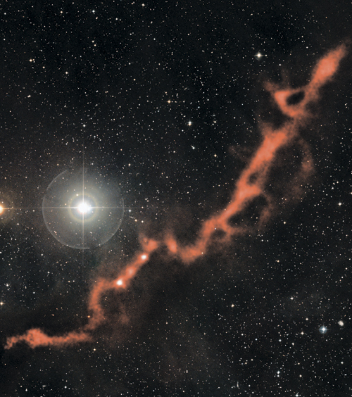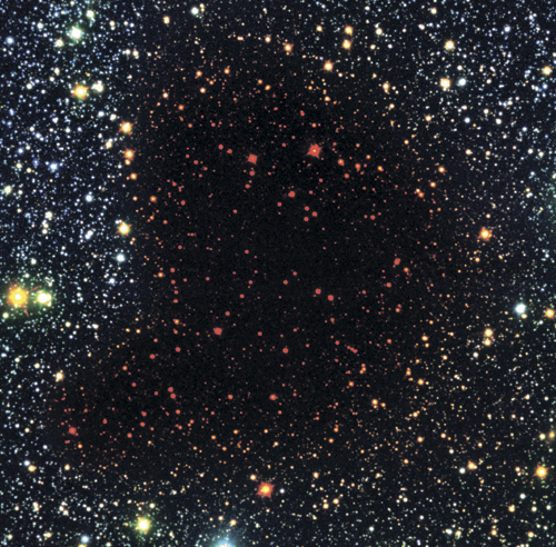 Еще одно изображение темного облака Барнард 68, на этот раз – в видимом и ближнем инфракрасном свете, который закодирован как красный канал. В отличие от снимка Барнарда 68, сделанного только в видимом свете, где облако выглядит полностью непрозрачным, здесь сквозь него видны звезды. Эта иллюстрация прекрасно показывает, насколько легче ближний инфракрасный свет проходит через плотную, пыльную и богатую газом среду в отличие от видимого света с меньшей длиной волны, который легко поглощается