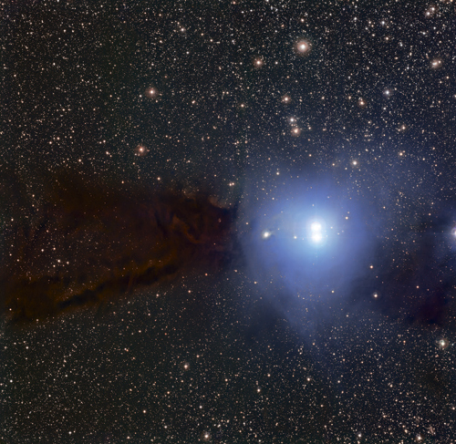 Темное облако Lupus 3 – пылевая молекулярная область в нашей Галактике; она непрозрачна для видимого света и заслоняет вид звездного фонового поля. Яркие голубые звезды – это новые, молодые и горячие светила, которые только что сформировались и появились из плотного темного облака. Синяя дымка, окружающая их, – это звездный свет, рассеянный пылью и газом в непосредственной звездной среде, – напоминает дымку, окружающую уличный фонарь в туманную ночь