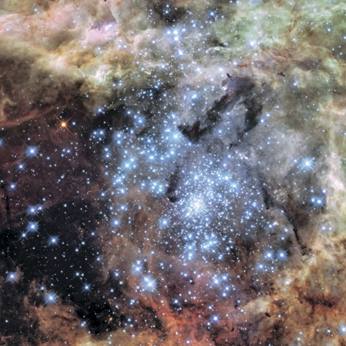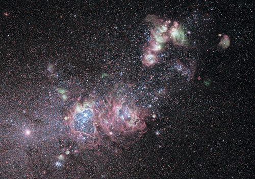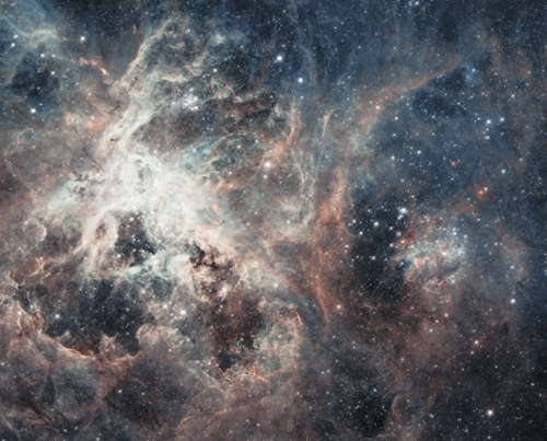 Крупный план туманности Тарантул. Эта область освещена скоплением голубых звезд, похожим на фейерверк. Эти недавно появившиеся на свет звезды очень массивны и горячи и испускают большое количество ультрафиолетового и оптического излучения, вакуумируя пузырь в туманности и вызывая свечение окружающего газа по мере его ионизации. Снимок показывает свет ионизированного кислорода и водорода