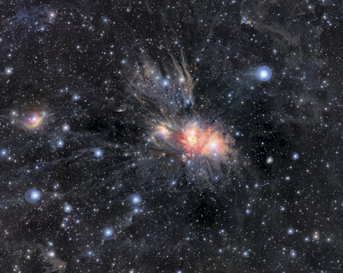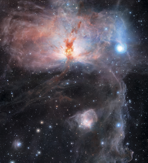 Снимок области активного звездообразования Единорог в галактике Млечный Путь сделан телескопом VISTA в инфракрасном режиме. На снимке изображена часть гигантского молекулярного облака, но здесь мы видим только те его фрагменты, где новые звезды, большинство из которых плотно сгруппированы вблизи центра этого изображения, освещают окружающий газ и пыль, которые отражают и рассеивают этот свет. Большое поле обзора и сверхчувствительные приемники VISTA идеально подходят для съемки подобных панорам, которые могут охватывать несколько градусов неба