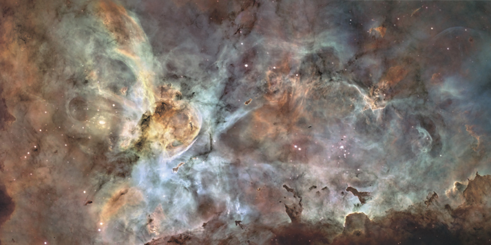 Этот замечательный снимок области звездообразования в Млечном Пути, туманности Киля, снят с помощью космического телескопа «Хаббл». Изображение показывает туманное свечение водорода, серы и кислорода, возбуждаемое светом, который излучается недавно сформировавшимися звездами. Они также формируют туманность, поскольку излучение и ветры, исходящие от поверхности звезд, разрушают окружающие газопылевые облака. Самые массивные звезды, образовавшиеся в этой туманности, быстро умрут – в течение нескольких миллионов лет после их рождения. Их смерть в результате взрывов сверхновых приведет к тому, что энергия и новые элементы вернутся в межзвездную среду. Сера и кислород, которые способствуют изменчивости этого места, – настоящее тому доказательство, так как эти элементы были сформированы предыдущими поколениями звезд