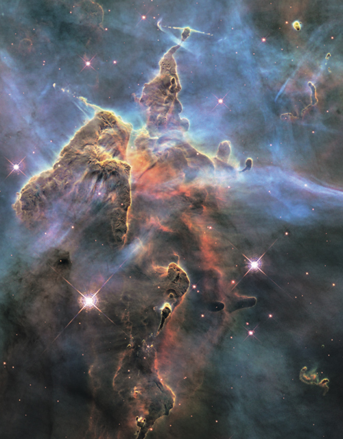 Снимок рождения звезд в туманности Киля сфокусирован на столпе газа и пыли, внутри которого образуются новые светила. Этот столп – лишь часть более крупного комплекса звездообразования в огромном облаке газа. Повсюду в дисках Млечного Пути и других звездообразующих галактик, где есть запасы холодного плотного газа и подходящие условия для запуска термоядерных реакций, разыгрывается этот сценарий. Столп звездообразования довольно непрозрачен даже для интенсивного света, испускаемого новыми звездами внутри него, но можно увидеть струи от некоторых молодых массивных звезд внутри столба, вырывающиеся вбок из колонны. Вся область искрится от света ионизированного газа и рассеянного свечения звезд. Звездообразование это энергетический процесс: излучение и ветер от самых массивных молодых звезд могут кардинально изменить и сформировать свое непосредственное окружение, а также стать частью энергии обратной связи, отвечающей за регулирование роста галактик