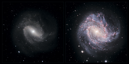 Два взгляда на одну галактику. Левый снимок представляет собой изображение М83 в ближнем инфракрасном свете, а правый – в видимом свете. Розовые и синие оттенки на изображении в видимом свете указывают на новые звезды и ионизированный газ областей HII, в основном в дисковых и спиральных рукавах галактики. Они невидимы на ближнем инфракрасном изображении, потому что молодые массивные звезды излучают бо́льшую часть своей энергии в ультрафиолетовой и синей частях спектра. И наоборот, более старшее и зрелое звездное население галактики дает много ближнего инфракрасного света, поэтому центральная полоса и балдж более заметны на левом изображении, хотя здесь также можно увидеть скопления гигантских красных звезд, которые связаны с областями звездообразования справа. Мы не видим такого распространения полос пыли на ближнем инфракрасном изображении, потому что эти фотоны могут лучше прорезать межзвездную пыль, чем легкопоглощаемые синие. Такие изображения галактик на разных длинах волн света позволяют нам снять больше слоев, словно в процессе анатомирования, и получить новые знания о многих различных компонентах галактик и связях между ними
