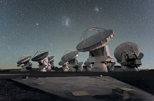 ALMA – комплекс из 66 антенн (54 антенн диаметром 12 м и 12 антенн диаметром 7 м), объединенных в единый астрономический радиоинтерферометр и расположенных на большой площади в высокогорной чилийской пустыне Атакама на плато Чайнантор на высоте около 5 км. Это международный проект, крупнейшие участники которого – США, Япония и страны Европы. Волшебство, сокрытое в таком количестве телескопов ALMA, заключается в том, что они могут быть связаны электронно, чтобы действовать как один очень большой телескоп, который использует область сбора света всех тарелок и получает очень высокое пространственное разрешение. Такая методика и называется интерферометрией. ALMA невероятно чувствителен в субмиллиметровом и миллиметровом диапазонах и, как только достигнет полной рабочей мощности, сможет обнаруживать молекулярный газ в таких же галактиках, как и Млечный Путь, но видимых ближе к началу космического времени. ALMA – удивительный прорыв в этой области астрономии, открывший новую эру исследования галактик, которая гарантирует нам захватывающие открытия на несколько десятилетий вперед.
