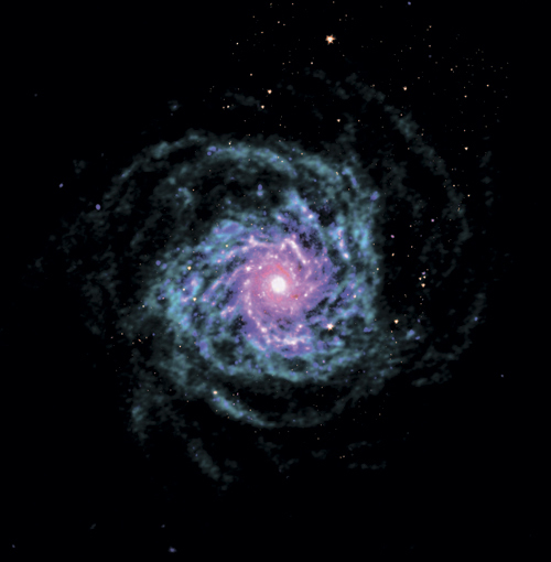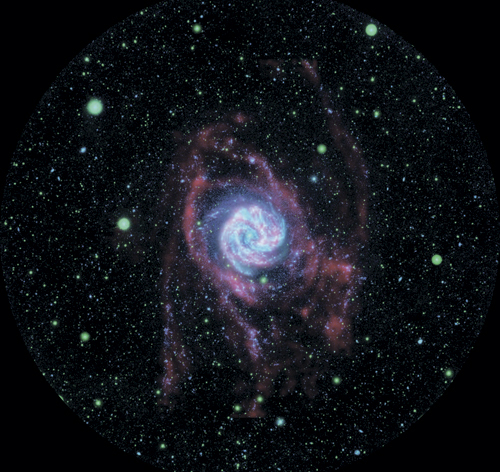 Это изображение спиральной галактики M83 объединяет в себе наблюдения УФ-излучения молодых массивных звезд (сине-розовая спираль), выполненные орбитальным телескопом GALEX, и радионаблюдения излучения нейтрального газообразного водорода (красные области). Обратите внимание, что нейтральный водород простирается далеко за пределы главной звездной структуры и частично прослеживается скоплениями голубых звезд – сигнатурами звездообразования в расширившихся газовых рукавах диска.Нейтральный атомарный водород является строительным материалом галактик и может быть использован для отслеживания внешней галактической среды, где мало звезд