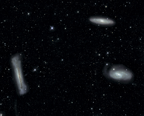 Ориентация галактик на небе случайна (хотя некоторые гравитационные эффекты могут служить для корреляции ориентации галактик в некоторых средах), поэтому мы видим лицевую сторону галактик, лежащих по отношению к нам ребром. Это наблюдение хорошо иллюстрирует снимок Триплета Льва – группы спиральных галактик в той части неба, которая содержит одноименное созвездие. Многие астрономические объекты названы в честь созвездий, в которых они могут быть найдены, например галактика Андромеды. Несмотря на то что сами галактики расположены намного дальше, чем составляющие астеризм звезды, легко идентифицируемые структуры созвездий дают нам удобный способ указывать местоположение того или иного объекта на небе