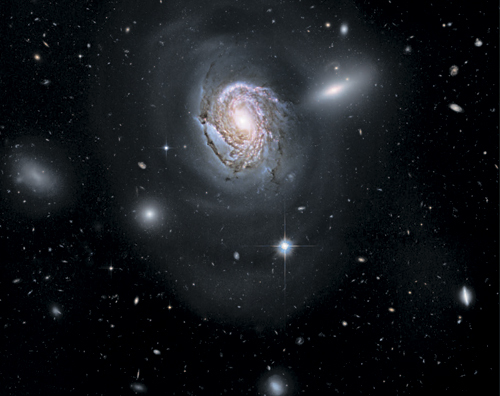 На этом глубоком изображении спиральной галактики NGC 4911 в скоплении галактик Кома (Волосы Вероники) видно слабое призрачное излучение звезд на дальних окраинах спиральных рукавов вокруг яркой центральной спирали, окрашенной в синий и розовый цвета с излучением звезды молодых звезд и туманного света областей HII, исчерченных полосами пыли. Протяженные внешние рукава искажены и гравитационно нарушены влиянием соседней галактики. В переполненной среде скопления галактик гравитационные взаимодействия между ними могут быть обычным явлением: они морфологически изменяют дисковые галактики, такие как NGC 4911, а также модифицируют историю их звездообразования путем возмущения или, в некоторых случаях, удаления их газовых резервуаров, содержащих строительный материал для будущих поколений звезд