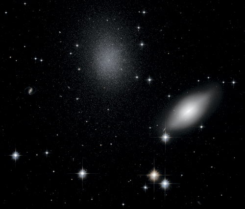 NGC 5011b и NGC 5011c – примеры большого разнообразия типов галактик. С одной стороны, у нас есть яркая линзовидная галактика с краями, пылающая светом миллиардов звезд и четко демонстрирующая выступающий диск и структуру балджа. С другой, мы видим относительно свободную сфероидальную коллекцию голубоватых звезд с довольно низким уровнем поверхностной яркости. Эти две галактики, находясь на одном участке неба, разделены огромным расстоянием: карликовая галактика слева довольно близка к нам, тогда как вторая находится в скоплении галактик Центавра на расстоянии около 50 млн пк