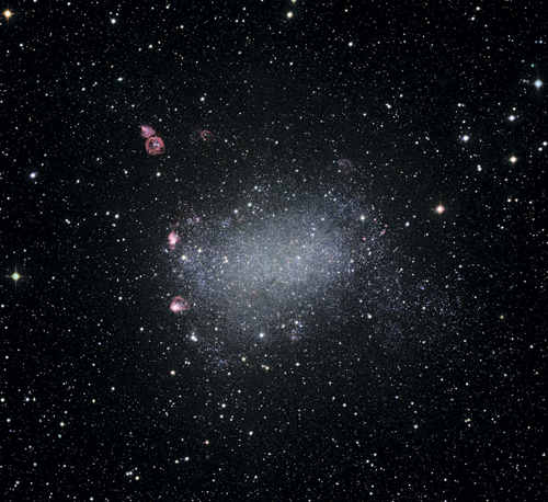 На снимке – иррегулярная карликовая галактика Барнард в Местной группе Млечного Пути. Это наш галактический сосед. Карликовые галактики гораздо менее массивны, чем Млечный Путь, и часто представляют собой аморфные скопления звезд и газа, иногда примыкающие к более массивным системам. На этом изображении можно увидеть несколько красных розеток светящегося водорода – сигнатуры активных областей звездообразования в галактике