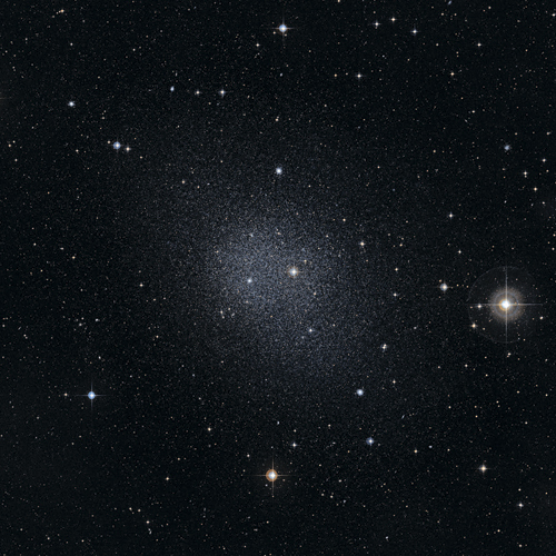 Это звездное пятно – карликовая галактика в созвездии Печи, спутник Млечного Пути с малой массой. Хотя многие карликовые галактики отличаются неправильной формой, эта классифицируется как сфероидальный карлик, так как морфологически звезды в нем довольно круглые и правильные
