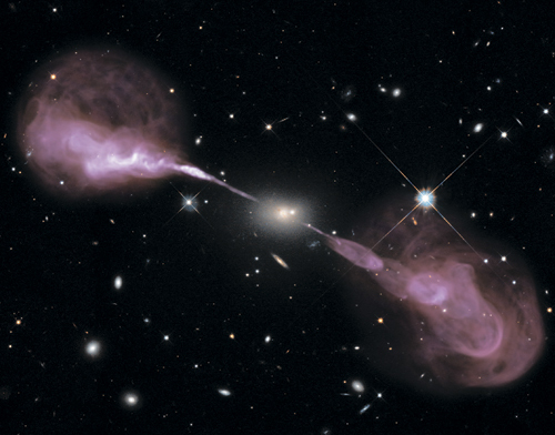 Радионаблюдения могут выявить замечательные вещи. На этом комбинированном изображении в радиоволнах (пурпурным) и оптическом свете радиогалактика Геркулес А раскрывается во всей своей красе. Центральная эллиптическая галактика содержит активную сверхмассивную черную дыру, которая питается за счет аккреции нового вещества – газа, пыли и звезд. Этот процесс порождает мощные струи радиоизлучения, вырывающиеся из галактики во внегалактическое пространство. Подобно струе дыма, радиоизлучение в итоге развеивается на большом галактическом расстоянии. Подобные радиоисточники относятся к самым мощным галактикам во Вселенной и играют важную роль в истории эволюции галактик, поскольку энергия, которую они накапливают в галактике-хозяине и локальной галактической среде, может модифицировать историю образования звезд в галактиках в ходе процесса обратной связи