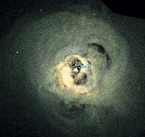 На снимке представлено изображение галактики в центре скопления Персея в рентгеновском излучении. Подобные раковине структуры – признак обратной связи от центральной галактики, вызванной истечениями из центральной сверхмассивной черной дыры, которая активно аккрецирует вещество. Поток отталкивает горячий газ, окружающий галактику и выявляемый в рентгеновском излучении, надувая «пузырьки» и «оболочки», которые распространяются наружу. Этот вид обратной связи регулирует рост массивных галактик, потому что он предотвращает гравитационную аккрецию слишком большого количества газа на центральную галактику, ограничивая тем самым ее звездную массу