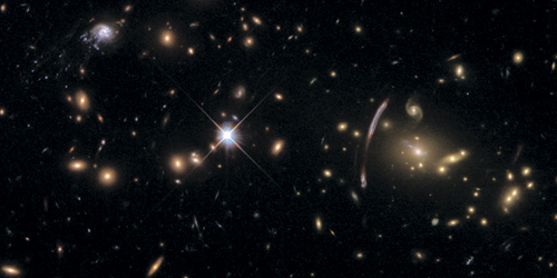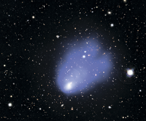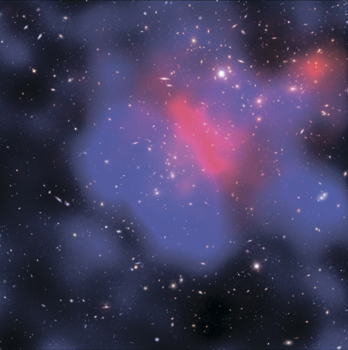 На снимке – кластер Abell 2744 (из Каталога скоплений галактик Эйбелла), также известный как скопление Пандоры. Здесь изображено рентгеновское излучение горячего газа между галактиками (фиолетовое) и распределение темной материи (синее), обнаруженные в результате проведения анализа гравитационного линзирования. Огромная масса скопления, бо́льшую часть которого составляет темная материя, искажает изображения галактик позади него. Это искажение можно использовать для картирования темной материи