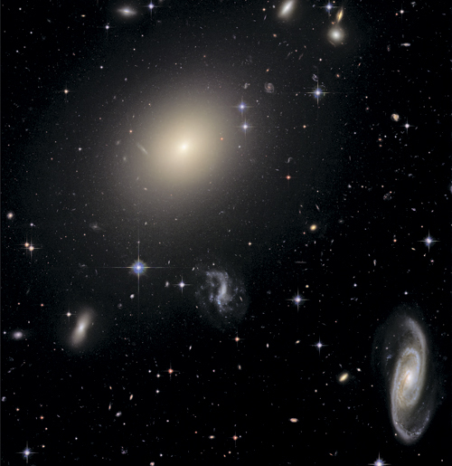 Это изображение скопления Abell S0740 четко показывает несколько типов галактик. Здесь преобладает большая яркая эллиптическая галактика, похожая на гигантский звездный шар. Рядом с эллиптической видны спиральные и линзовидные галактики, а также многие другие на заднем плане. Эллиптическая галактика совершенно бесформенна по сравнению со спиралями: она отличается очень ровным звездным распределением, полос пыли не видно, а все звезды – одинакового оттенка. Так происходит потому, что эллиптические галактики, как правило, мертвы, ведь при небольшом количестве оставшегося газа в них больше не могут зарождаться новые звезды. Равномерный красный цвет последних указывает на старое звездное население: бо́льшая часть эволюции этой галактики в прошлом, а слияния и взаимодействия, вероятно, были важны для ее формирования. Слияния галактик могут разрушать диски с вращательной поддержкой, посылать звезды на случайные орбиты и приводить к более выпуклой морфологии с поддержкой давления