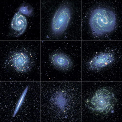 Изображения галактик, наблюдаемых в инфракрасных диапазонах с помощью космического телескопа NASA «Широкоугольный инфракрасный обзорный исследователь» (англ. Wide-field Infrared Survey Explorer, WISE), который картировал все небо на длинах волн 3, 4, 4, 6, 12 и 22 микрона