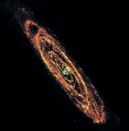Это изображение галактики Андромеды на длинноволновой части инфракрасной области спектра, полученное космической обсерваторией «Гершель». Излучение в дальнем инфракрасном диапазоне отслеживает холодную пыль, которая в галактиках, подобных M31, концентрируется в спиральных рукавах, что наглядно показано на этой иллюстрации. Пятна, где излучение ярче, указывают на расположение плотных областей звездообразования: там ярко светится пыль, покрывающая газовые облака, в которых образуются новые звезды