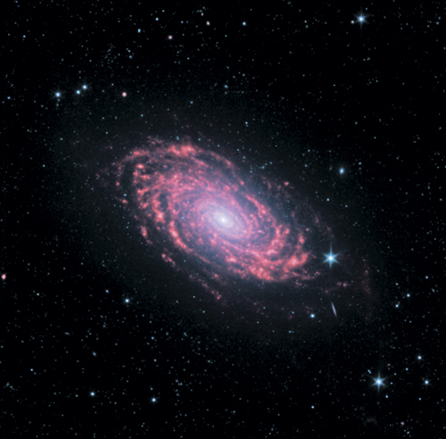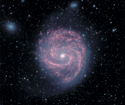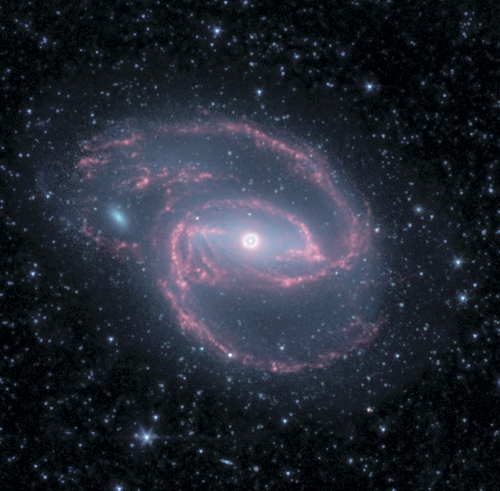 Изображение спиральной галактики M100, видимой в средней инфракрасной части электромагнитного спектра на длинах волн 3–8 микрон, сделанное космическим телескопом «Спитцер». Срединные полосы отслеживают теплую пыль, связанную с областями звездообразования. В отличие от оптических изображений, где пыль блокирует свет от звезд, на инфракрасных длинах волн сама пыль светится (красным), в то время как свет звезд намного слабее (голубой). Центральная область этой галактики ярко сияет там, где есть кольцо довольно интенсивного звездообразования, а плотные спиральные рукава четко подсвечены многими яркими «узлами» звездной активности. Инфракрасные наблюдения дают дополнительное представление о галактиках, что очень важно, учитывая повсеместную распространенность межзвездной пыли