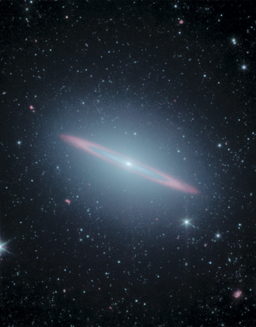Еще одно изображение в средней инфракрасной области спектра, на этот раз – знаменитой галактики Сомбреро, которое также было получено с помощью космического телескопа «Спитцер» в средних инфракрасных диапазонах (3–8 микрон). Галактика Сомбреро слегка наклонена от края, если смотреть с нашей точки наблюдения; ее наиболее яркая характеристика – большой пылевой диск, который представляет собой кольцо, окружающее эллиптическое распределение относительно старых звезд. На этом инфракрасном изображении кольцо пыли, нагретое звездным светом, сияет красным