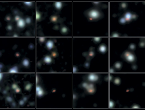 Красные/оранжевые пятна в центре каждой панели – очень далекие галактики, излучающие бо́льшую часть своего света в субмиллиметровой части электромагнитного спектра. Одним из главных достижений в области изучения эволюции галактик стало открытие того, что в прошлом общая скорость роста галактик, отслеживаемая за счет вычисления средней скорости звездообразования, была намного выше. Некоторые из самых ранних галактик формировали звезды с удивительно высокой скоростью – в сотни раз быстрее, чем Млечный Путь. Галактики, где происходят интенсивные «вспышки» звездообразования, также содержат большое количество пыли. Она блокирует значительную часть видимого света от звезд, в результате поглощения которого нагревается в поле звездного излучения. Эта энергия переизлучается в дальнем инфракрасном диапазоне электромагнитного спектра и из-за эффекта красного смещения легко обнаруживается в субмиллиметровых полосах диапазона. Галактики этой категории называются субмиллиметровыми. Чем интересен этот класс галактик? Одна теория утверждает, что субмиллиметровые галактики – это прародители массивных эллиптических галактик, которые мы видим сегодня. Однако их можно увидеть в то время, когда они только формировали бо́льшую часть своей звездной массы, поэтому изучение отдаленных субмиллиметровых галактик могло бы дать представление о физике образования самых массивных галактик в космосе