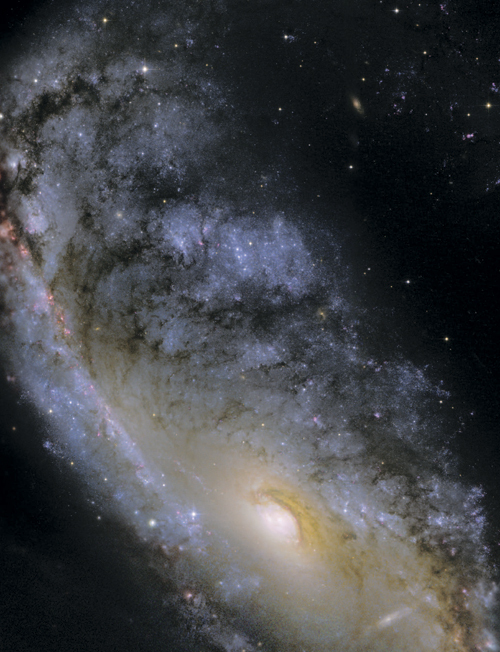 На снимке – элемент одного из рукавов галактики, известной как Мясной Крюк. Она была названа так из-за ее искаженной спиральной структуры, предположительно ставшей следствием предыдущего гравитационного возмущения из-за прохождения другой галактики. Ее рукав искрится множеством молодых голубых звезд, словно кружево пены на гребне волны
