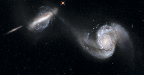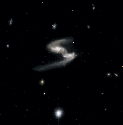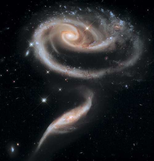На снимке две галактики вовлечены в гравитационный танец – это пара взаимодействующих спиральных галактик Arp 273, слитых гравитацией. Гравитационное слияние оказывает приливное воздействие на звезды, газ и пыль, искажая структуру каждой галактики. В конце концов пара объединится в новую систему, перераспределив в процессе звезды и газ. Взаимодействие может вызвать коллапс газовых облаков в дисках галактик, и поэтому результатом таких слияний систем часто становится формирование новых звезд