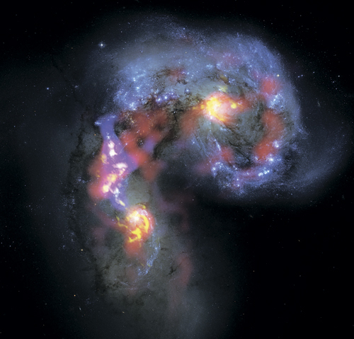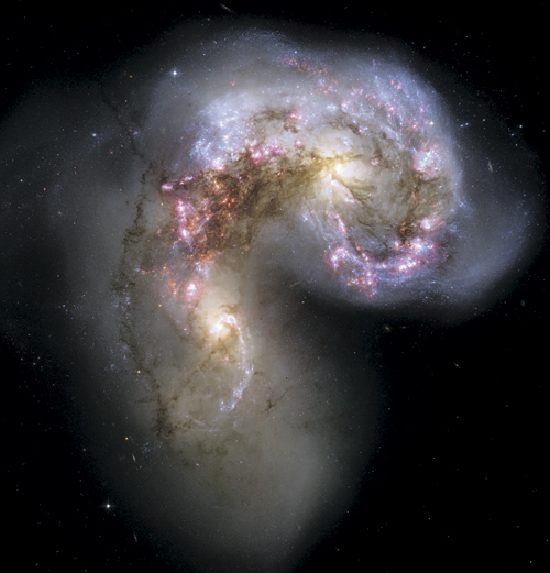 Еще одна известная пара взаимодействующих галактик – Антенны. Снимок сфокусирован на ядрах двух галактик, близких к слиянию. Красный свет показывает присутствие HII, связанного с новыми звездами, которые обретают жизнь, когда гравитационное взаимодействие разжигает и сжимает холодный газ (первоначально он был расположен в дисках двух галактик). Многие только что родившиеся звезды можно увидеть в синем свете – как всегда, межзвездная пыль не позволяет части оптического света проходить сквозь нее, особенно в тех областях, где звездообразование активнее всего