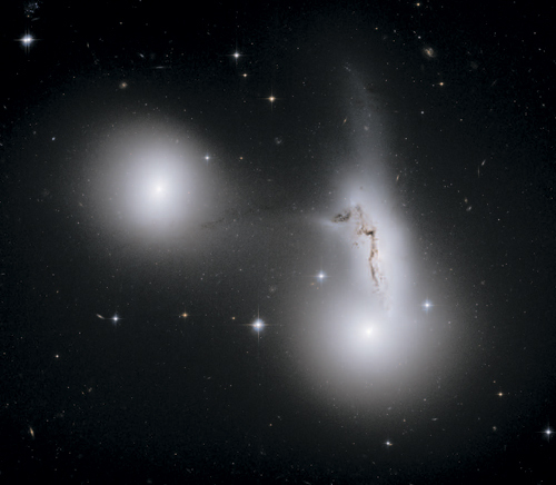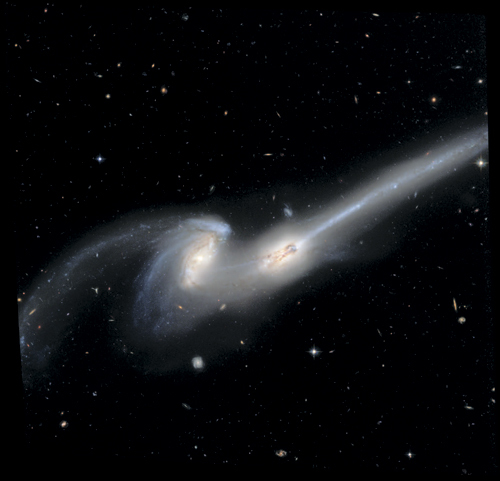 Взаимодействующая пара галактик Arp 87, соединенная тонкой цепью звездного света, – в итоге они должны слиться в единую галактику. Признаки недавнего звездообразования, вызванного слиянием, можно увидеть в голубом звездном свете вокруг галактики слева и в нарушенном спиральном рукаве галактики справа, который словно инкрустирован яркими, подобными драгоценным камням точками света – скоплениями новых звезд