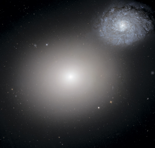 Arp 116 – это пара взаимодействующих галактик в скоплении Девы: эллиптическая и спиральная. Предполагается, что это гравитационное взаимодействие только началось, но изображение прекрасно контрастирует с морфологическими характеристиками галактик: эллиптические галактики представляют собой гигантские сфероидальные скопления старых звезд, обычно не образующие новых. Спиральные галактики построены в виде диска (в этом случае спиральные галактики находятся почти лицом к лицу) и стремятся к активному формированию звезд