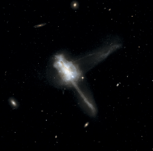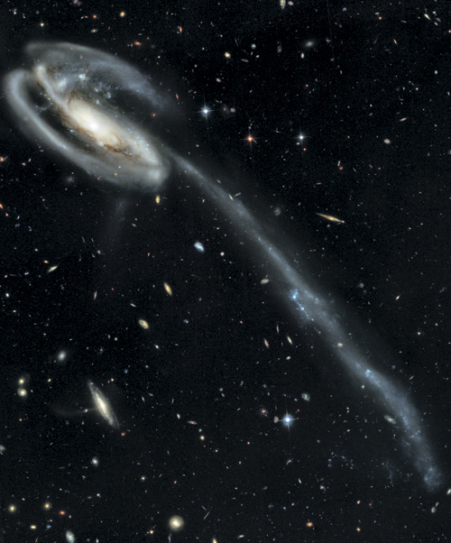 Это разрушенная приливом галактика, которая по понятным причинам известна как Головастик. В этом случае меньшая галактика врезается в бо́льшую спираль, оставляя след звезд в длинном, затянувшемся потоке, вытесненном приливными силами. В этом потоке можно увидеть несколько скоплений массивных голубых звезд, что указывает на пятна активного звездообразования в хвосте, который также содержит холодный газ, невидимый на этих длинах волн. Некоторым из этих звездных скоплений, возможно, суждено стать шаровыми, которые будут притягиваться основным телом галактики и окружать его. На заднем плане показаны тысячи других, более отдаленных галактик