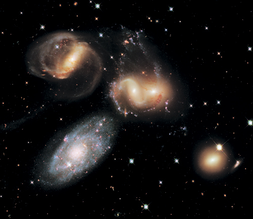 Квинтет Стефана – группа галактик, открытых Эдуардом Жан-Мари Стефаном в XIX веке. Голубая галактика в левом нижнем углу физически не связана с группой, но помимо нее есть три красные галактики, находящиеся в процессе слияния. Это взаимодействие морфологически нарушает галактики, вырывает газ и звезды и запускает новые процессы звездообразования в нарушенной материи. Снимок показывает это в веере звезд в верхнем левом углу центральной красной галактики: пятна красного и синего цветов указывают на присутствие ионизированного газа (области HII), а молодые голубые звезды образуются в облаках возмущенного, коллапсирующего газа, выдавленного из диска галактики