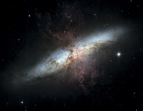 Изображение M82 в оптическом свете показывает довольно иррегулярную, но почти дискообразную галактику, наклоненную в нашу сторону. Туманные оранжево-голубые оттенки звездного населения пронизаны более темными бороздами пыли, хотя на самом деле бо́льшая часть действий происходит вблизи ядра галактики. Однако если мы возьмем изображение в H-альфа (таким образом обнаруживая ионизированный газообразный водород) и рентгеновском свете (отслеживая очень горячую плазму), то увидим извержение горячего газа, вытекающего со всех сторон диска в два огромных конусовидных протуберанца. Такой процесс называется эмерджентным суперветром, когда газ выдувается из галактики в окружающую ее среду. Наблюдения на других длинах волн показывают, что эти потоки также содержат холодный газ и пыль, смешанную с более горячим веществом, которое, скорее всего, было подхвачено ветром, когда он вытекал из M82 со скоростью миллионы километров в час.