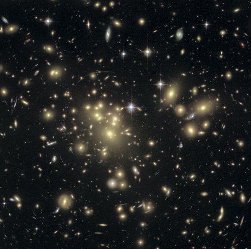 На фотографии – плотное скопление галактик Abell 1689. Кластеры являются одними из самых массивных гравитационно связанных структур во Вселенной, и среди галактик в ядрах скоплений, подобных этому, преобладает эллиптический тип – массивные старые галактики с небольшим образованием звезд. Галактики, сформировавшиеся на ранних этапах истории Вселенной, появились, когда самые большие флуктуации плотности в исходном поле материи превратились в массивные структуры, похожие на эту. Abell 1689 прекрасно раскрывает сигнатуру гравитационного искажения пространства-времени, предсказанного общей теорией относительности Эйнштейна: вокруг ядра скопления можно увидеть гравитационные дуги – изображения более отдаленных галактик вдоль линии обзора, свет которых был согнут и искажен промежуточной материей. Мало того, что гравитационное линзирование может быть использовано для очень подробного изучения очень далеких галактик (поскольку они увеличены) – картина искажений еще может быть использована и для восстановления общей массы скопления, предоставляя доказательства существования такого компонента, как темная материя
